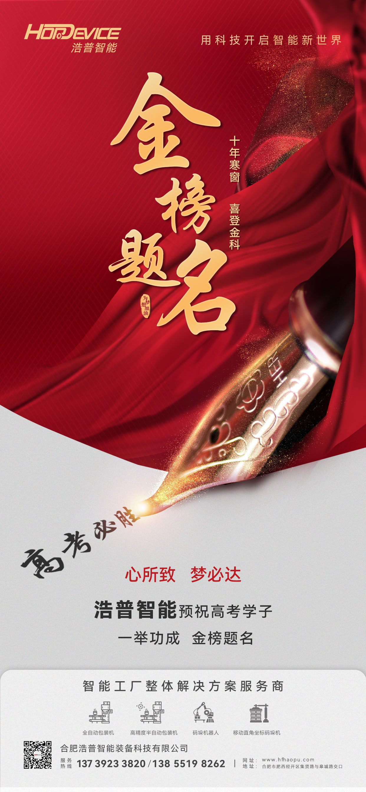 在這個(gè)陽(yáng)光明媚的六月,我們迎來(lái)了一年一度的高考。對(duì)于無(wú)數(shù)學(xué)子來(lái)說(shuō),這不僅是一場(chǎng)知識(shí)的考驗(yàn),更是一場(chǎng)青春的洗禮,一場(chǎng)智慧的較量。浩普智能,作為一家致力于科技創(chuàng)新和智能智造的企業(yè),我們深知智慧和勇氣的重要性。在此,浩普智能向每一位踏入考場(chǎng)的學(xué)子致以最誠(chéng)摯的祝愿,祝愿所有參加高考的學(xué)子們,旗開(kāi)得勝,金榜題名!