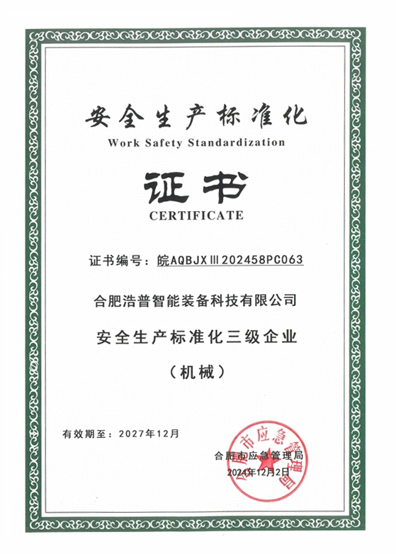 近日,從合肥市應急管理局獲悉,合肥浩普智能裝備科技有限公司順利通過了合肥市安全標準化達標驗收,正式被核準為“安全生產(chǎn)標準化三級企業(yè)”,并頒發(fā)資質(zhì)證書。