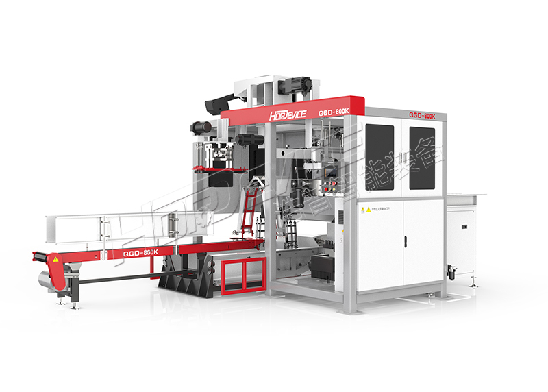 裝袋機:能自動連續(xù)取袋、開袋、自動檢測、自動裝袋等。電子定量秤內(nèi)放好的物料通過料斗計量后裝入料袋,并將料袋傳送到立袋輸送機上。該部機可實現(xiàn)氣爪手夾袋,真空吸盤開袋,正、負(fù)壓檢測自動棄袋等功能;